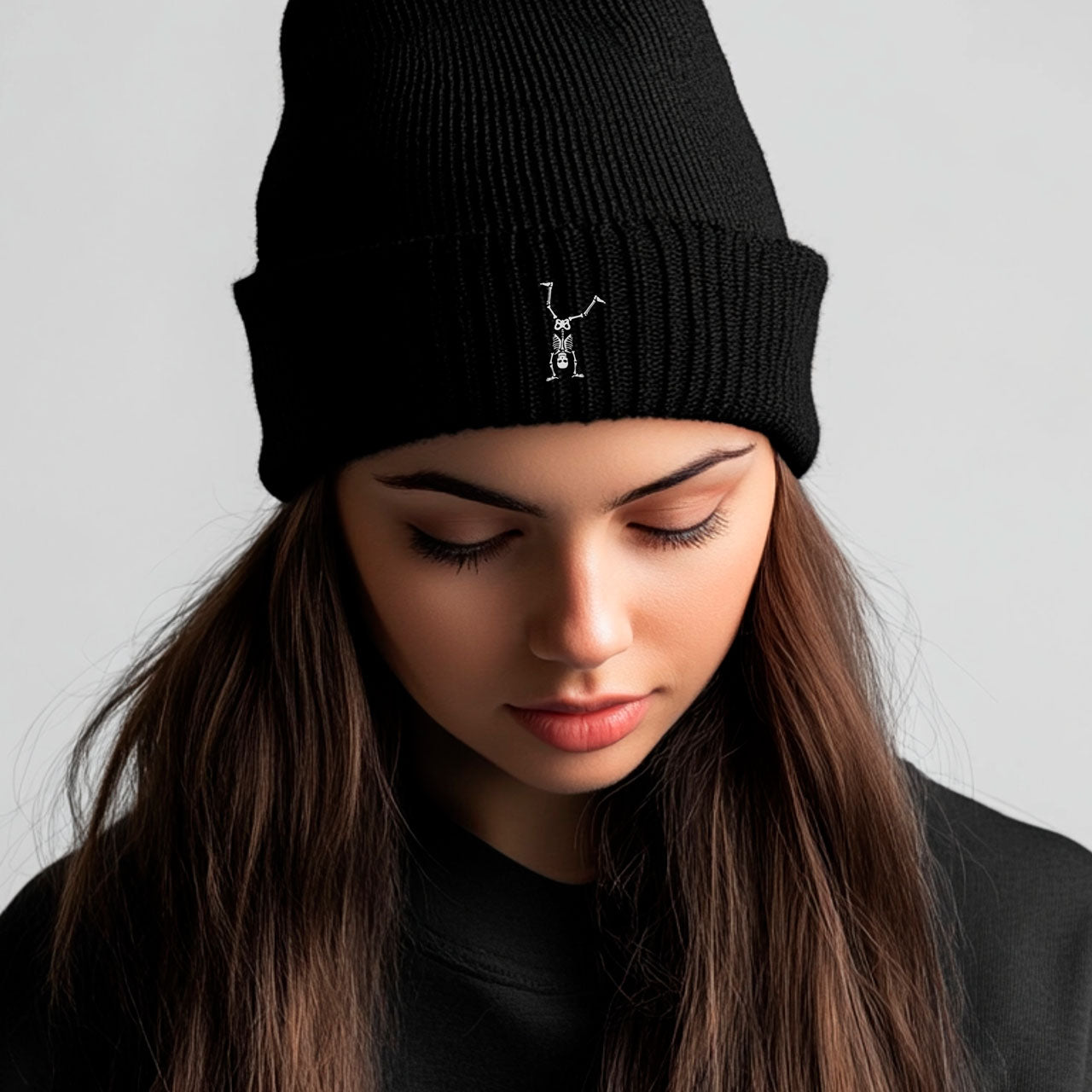 Designed for minimalists who appreciate a quirky touch, this 100% organic cotton cuffed beanie features a subtle yet fun embroidered skeleton mid-cartwheel.