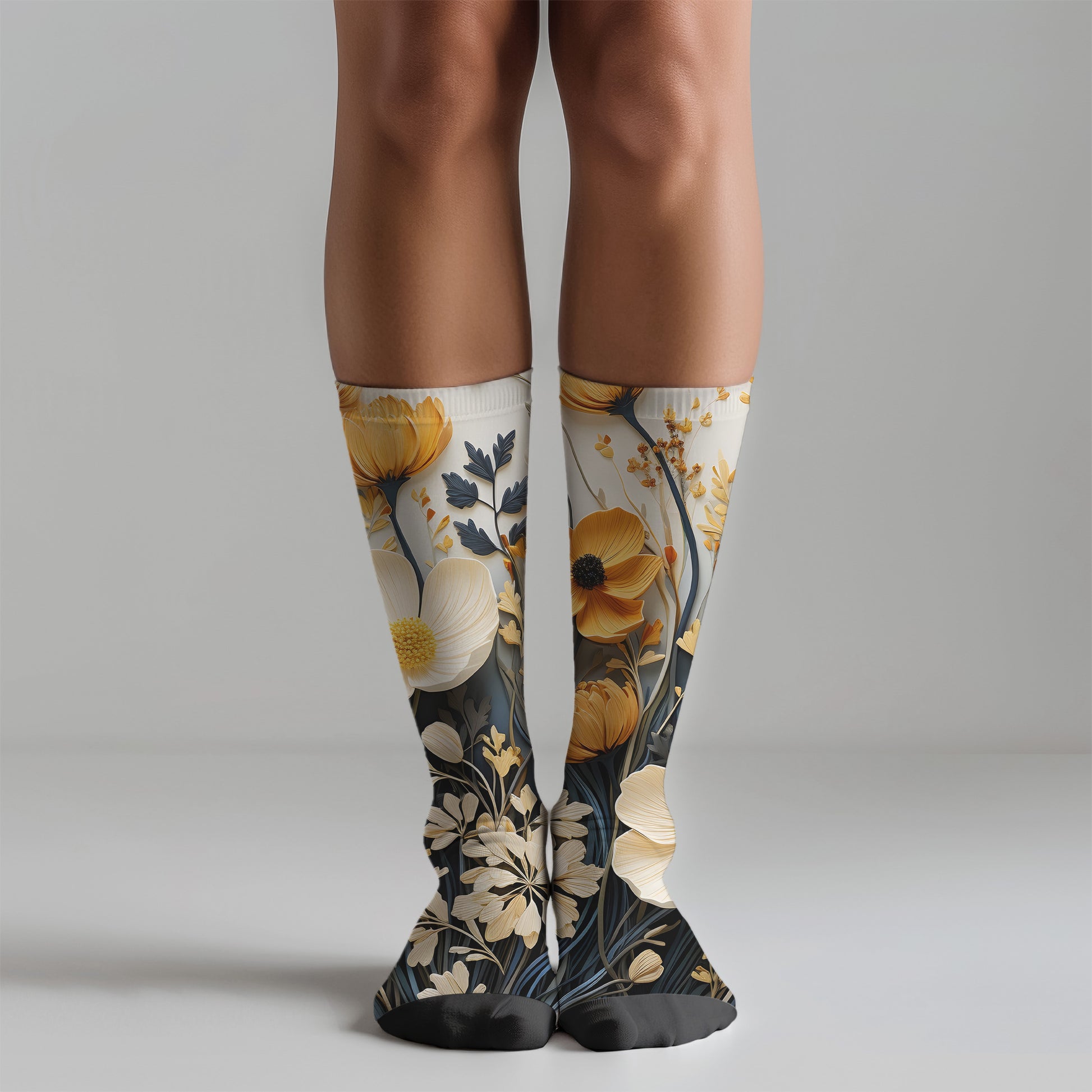 Add a bit of charm and whimsy to your wardrobe with these 3D floral print socks. Delightfully soft and cushy, these 3/4 length crew socks are perfect for lounging at home or for turning heads wherever you go.