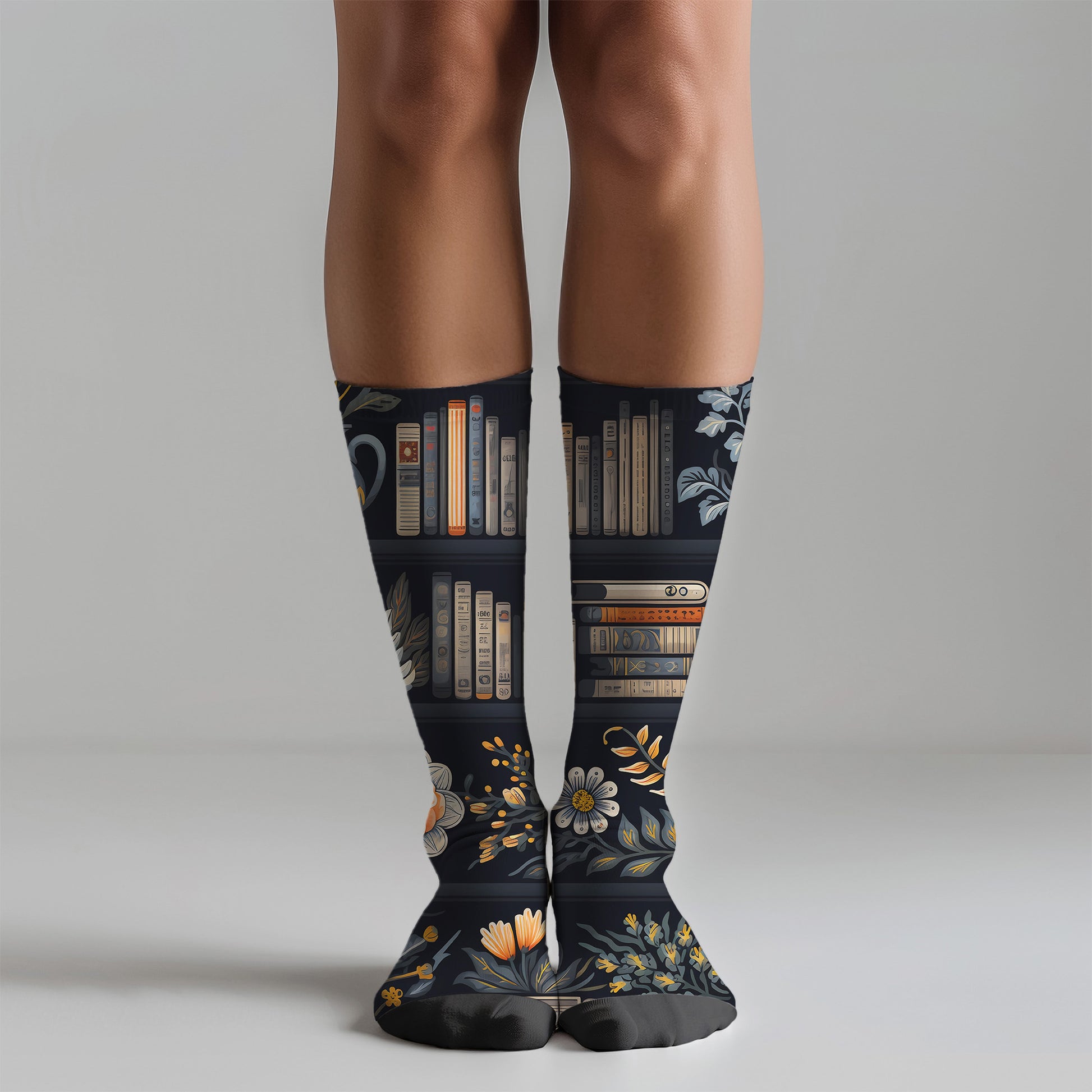 Bookish charm meets comfort in these cozy and whimsical cushioned crew socks featuring a bookshelf full of books and flowers. These socks are delightfully cushy and as soft as a well-loved novel making them perfect for a day at home reading or browsing your favorite bookshop.