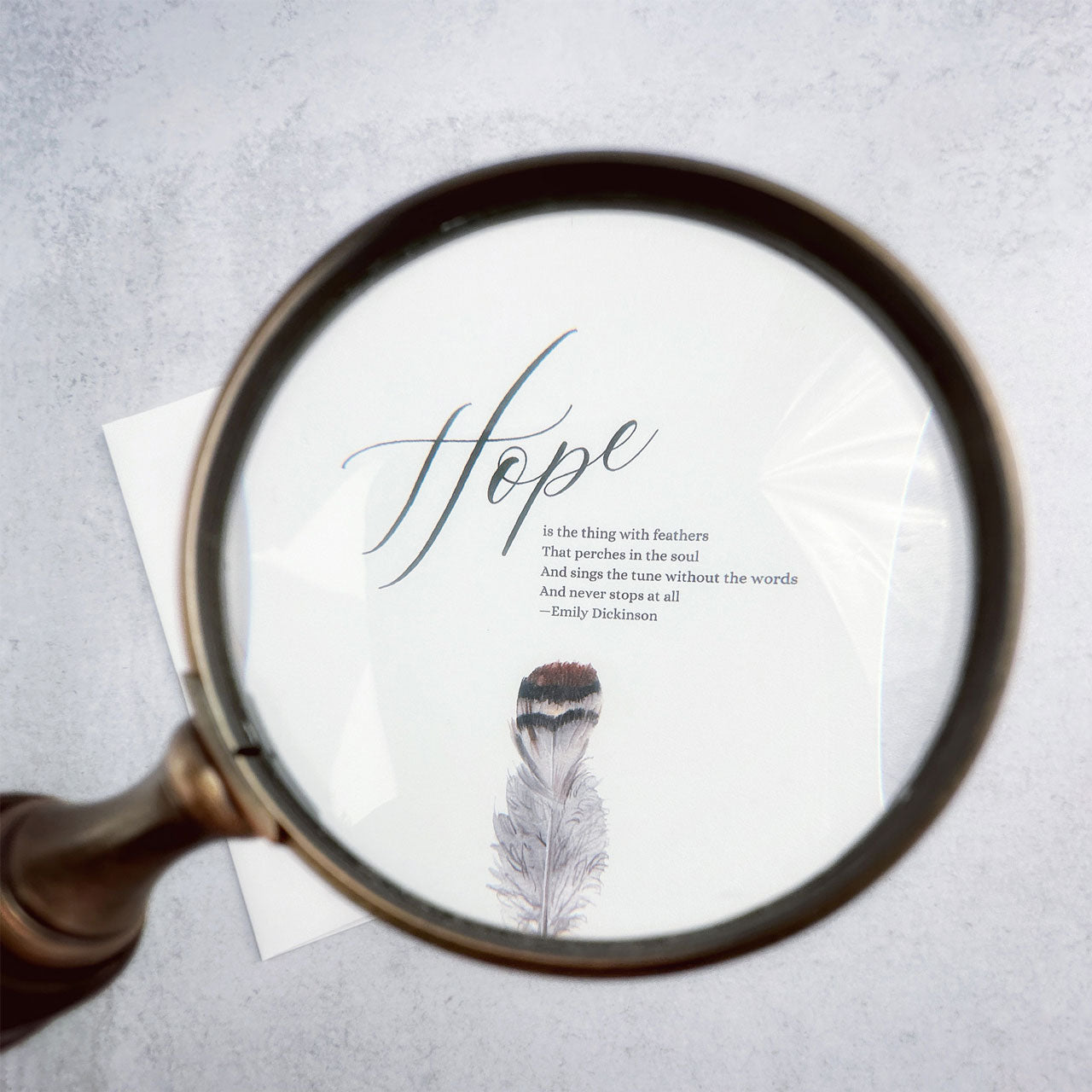 The first few lines of an uplifting poem by Emily Dickinson are featured on our Hope Card. The clean, minimal design allows the heartfelt words to take center stage, framed by a delicate foiled border. Perfect for sending a message of encouragement and support. Blank inside.