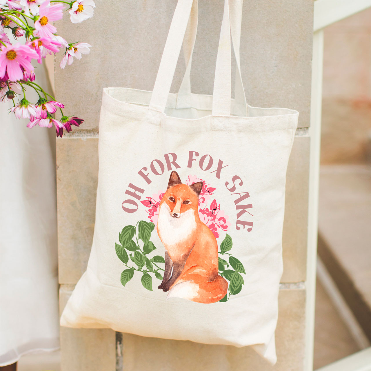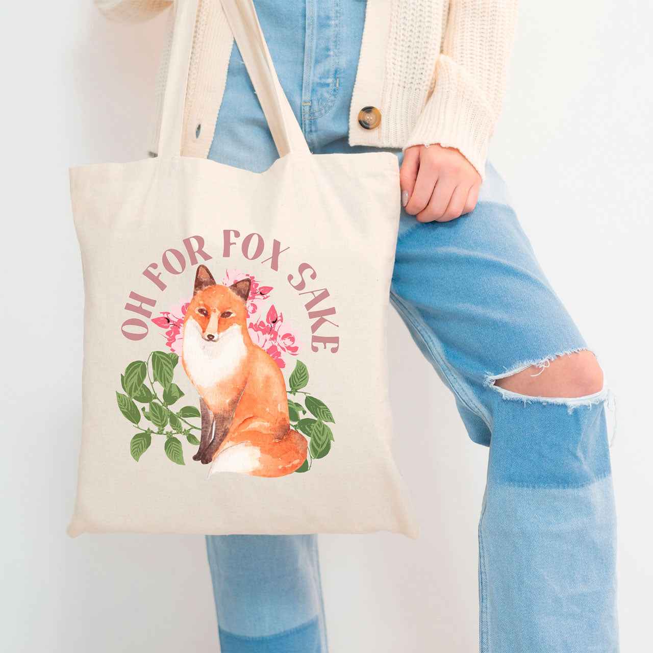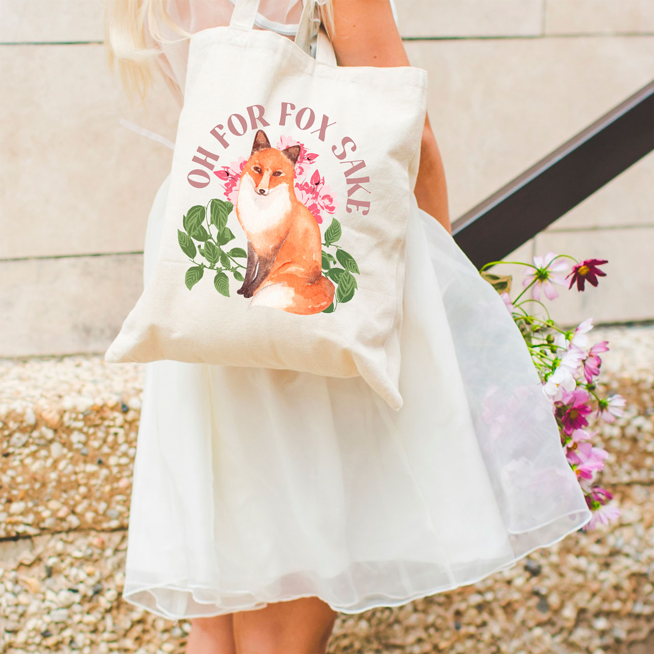 Add a bit of wit and sarcasm to your day with our "For Fox Sake" tote bag.