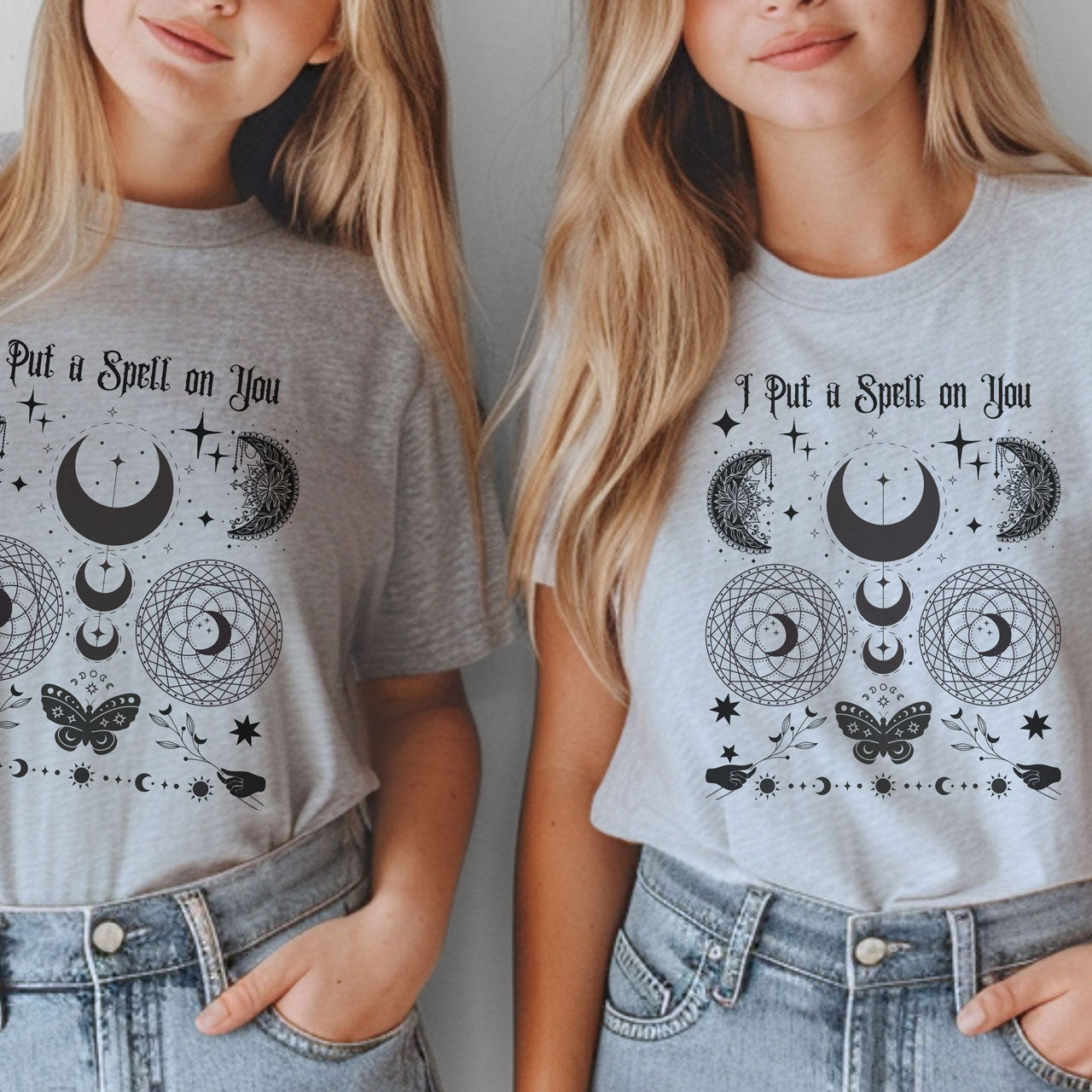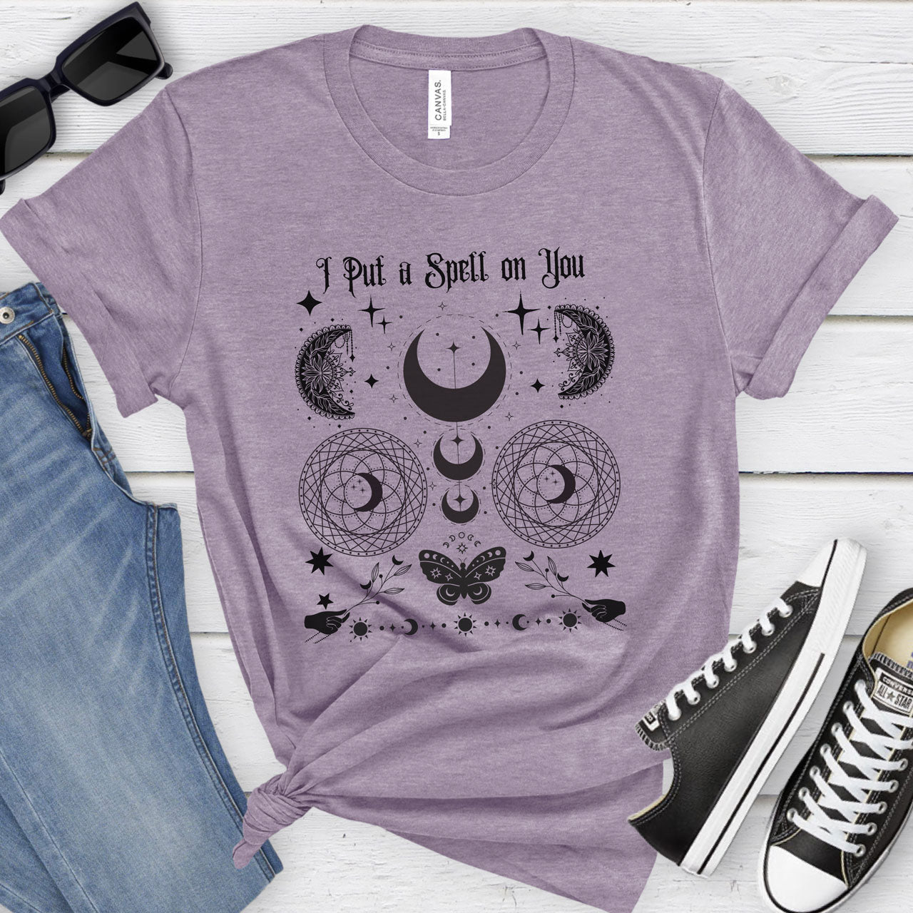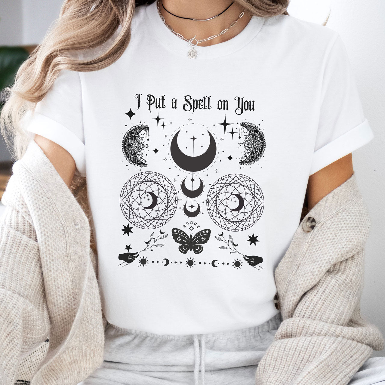 Add some magic to your day with this enchanting tee featuring a celestial design and the playful phrase I Put a Spell on You. Perfect for those who love to mix a little mystique with their style, this tee is sure to leave everyone under your spell.
