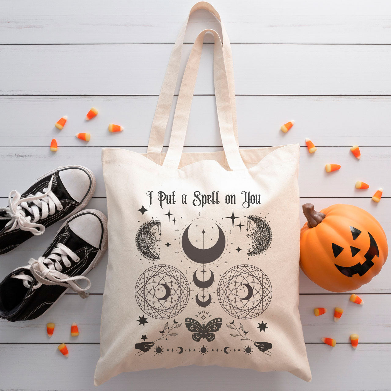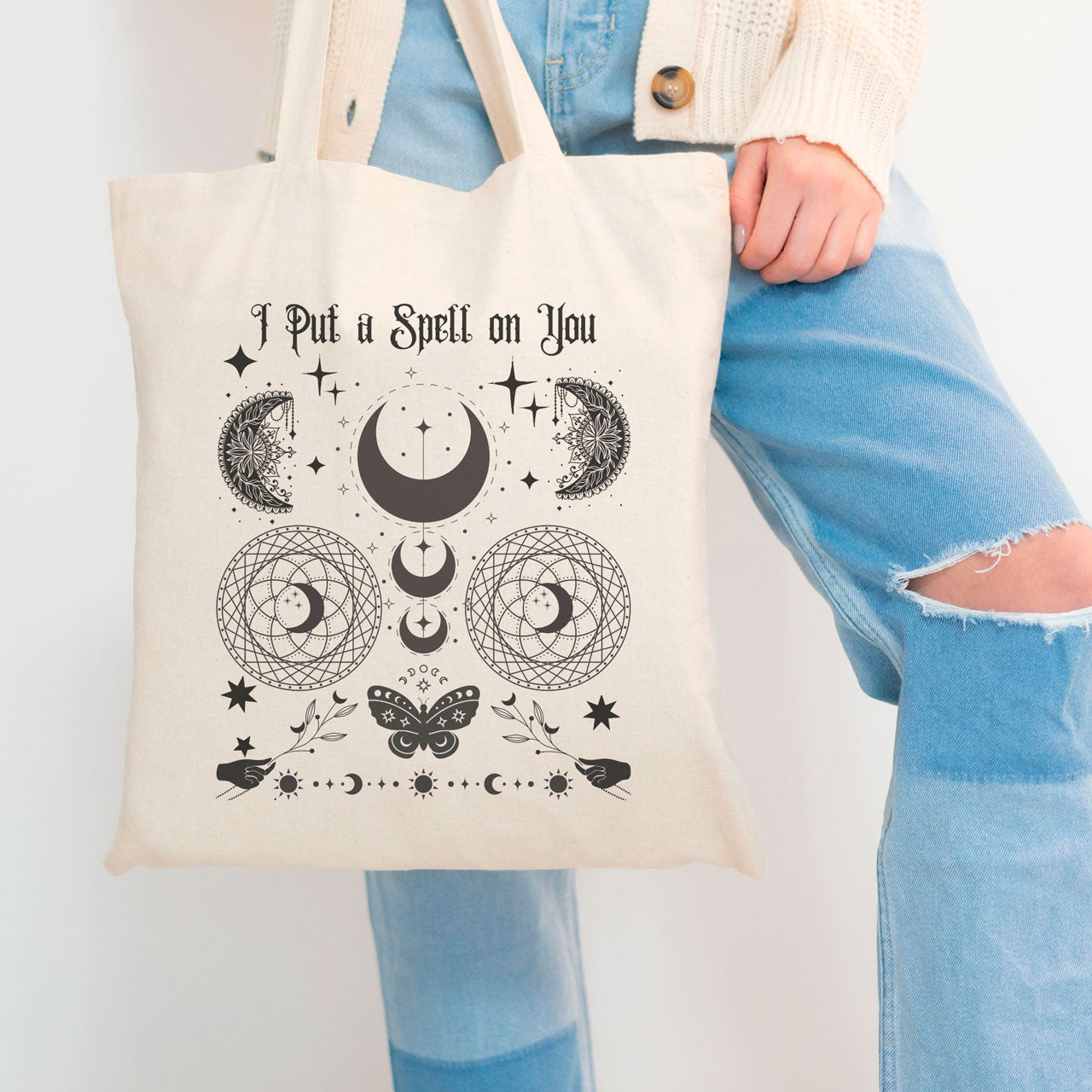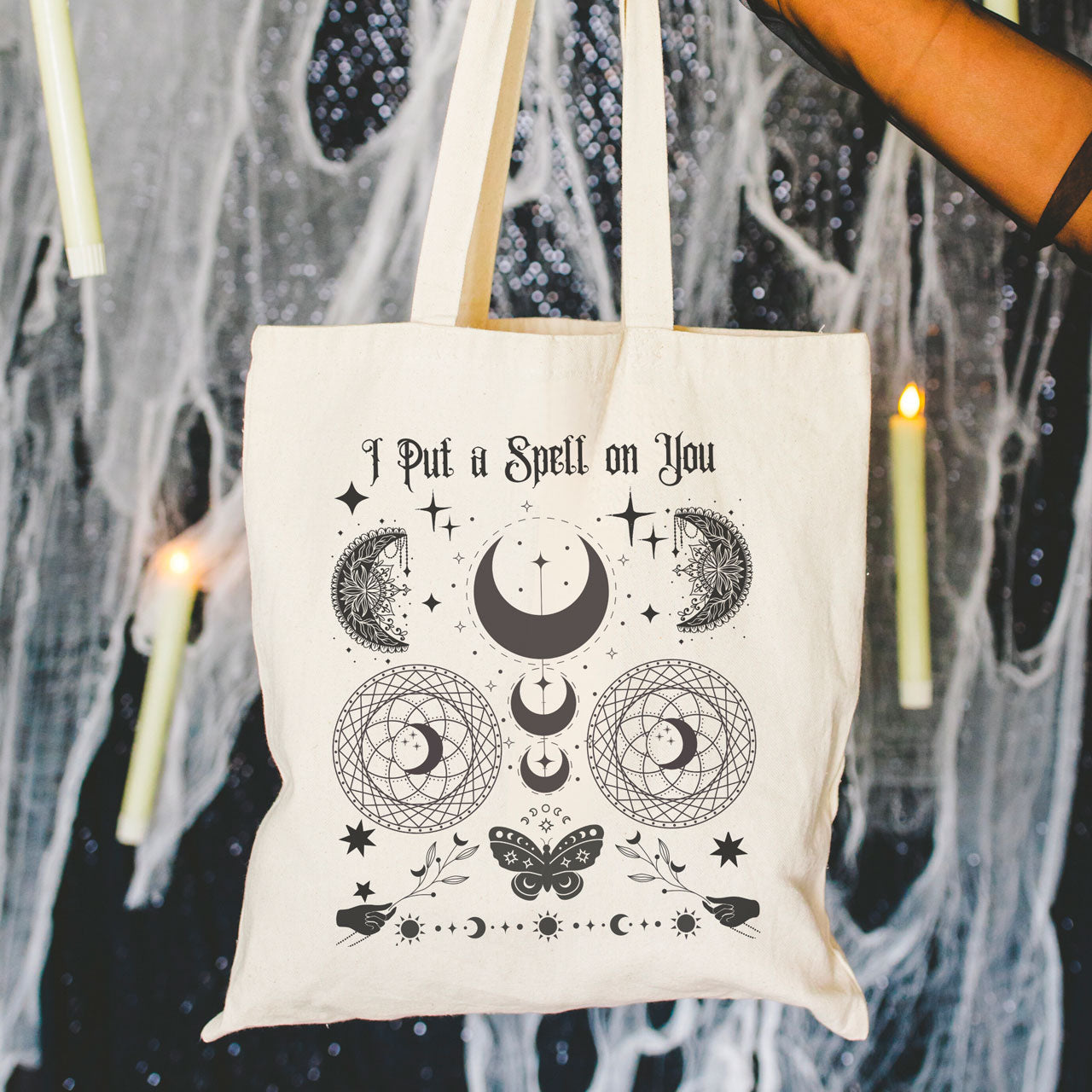 Add some magic to your day with this enchanting canvas tote featuring a celestial design and the playful phrase I Put a Spell on You. Perfect for those who love to mix a little mystique with their style, this tote is sure to leave everyone under your spell.