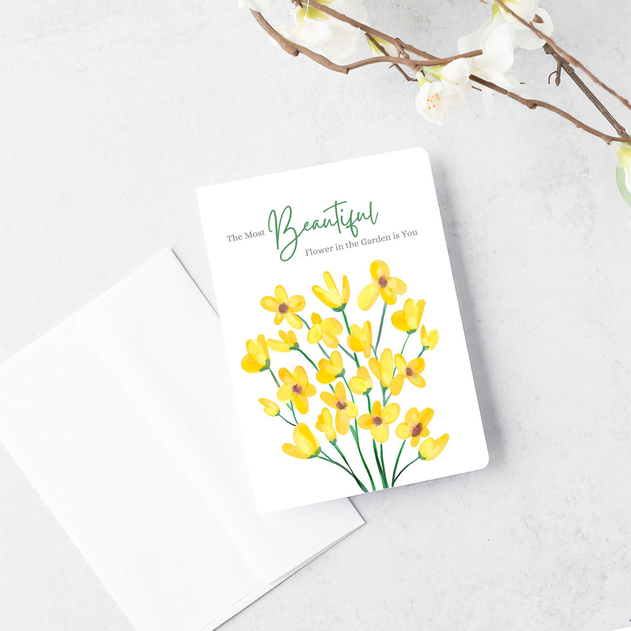 Express your love and appreciation to mom with this sweet and simple card featuring a vibrant bouquet of flowers with the phrase "the most beautiful flower in the garden is you." Printed on a smooth, quality cardstock for a premium feel. The sentiment inside reads: