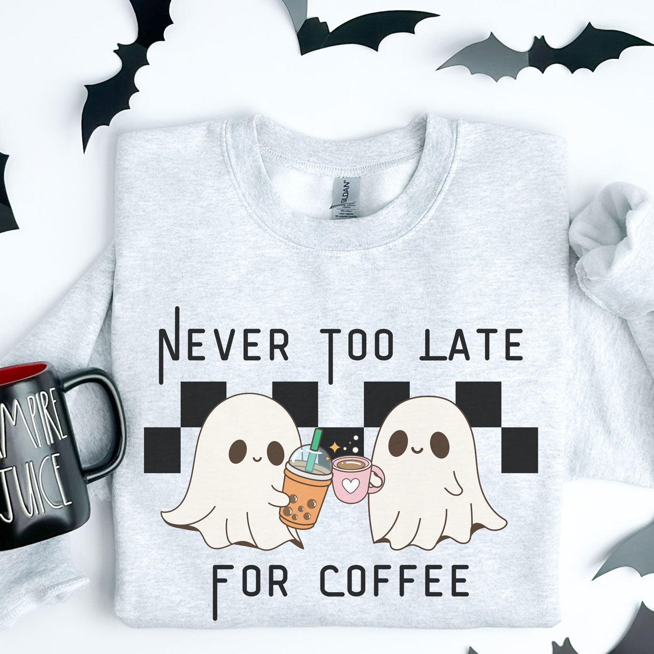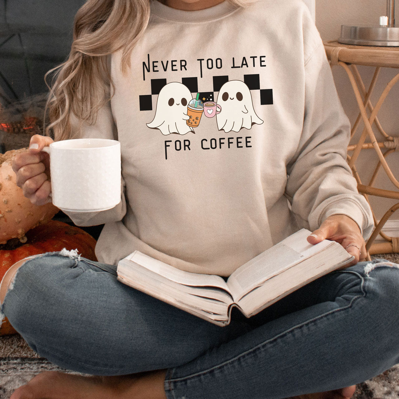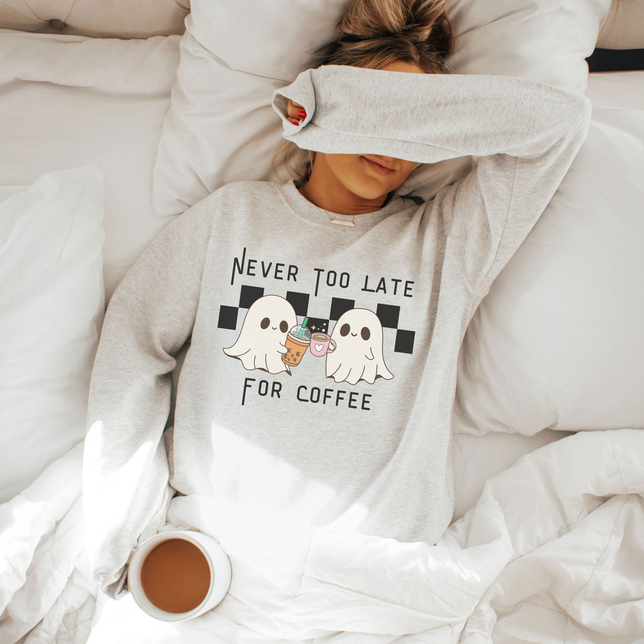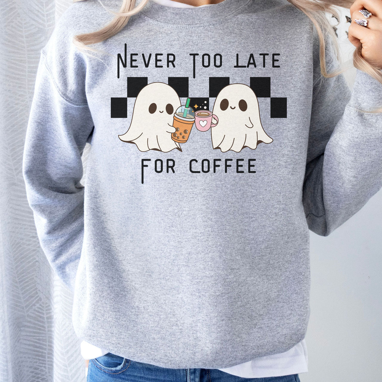A couple of adorable retro style ghosts are front and center on this cozy Never Too Late for Coffee sweater. Perfect for Halloween and coffee enthusiasts alike, this shirt adds a playful retro vibe to your seasonal wardrobe while keeping you safely snug and warm.
