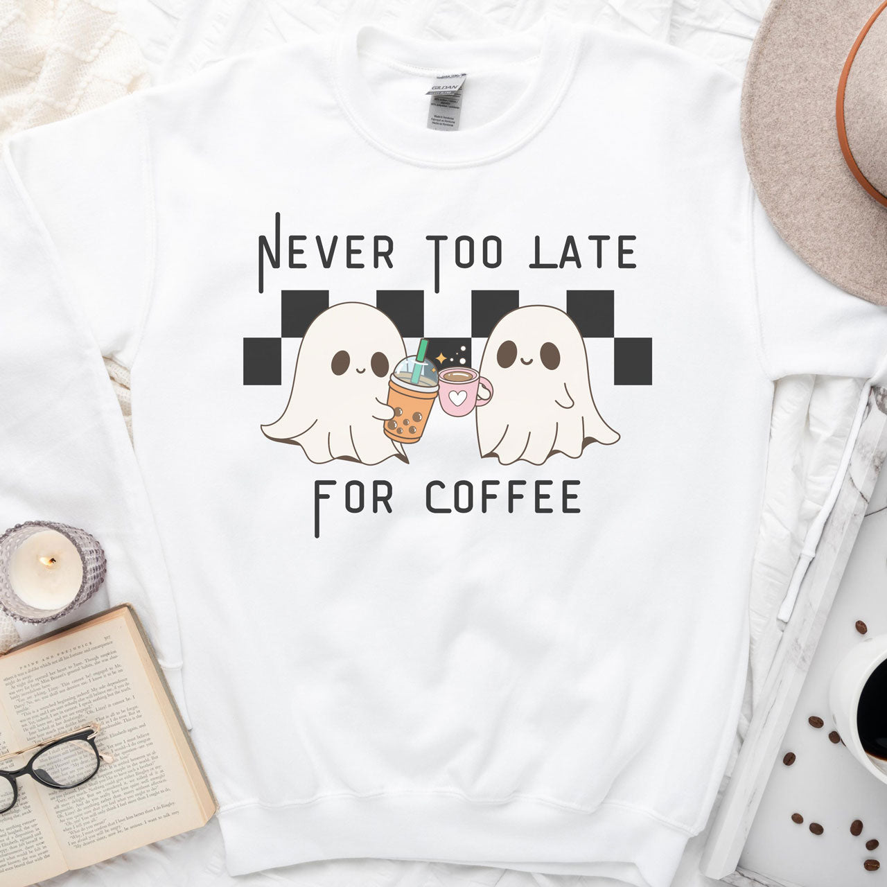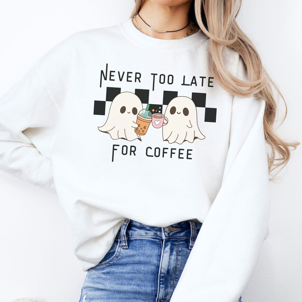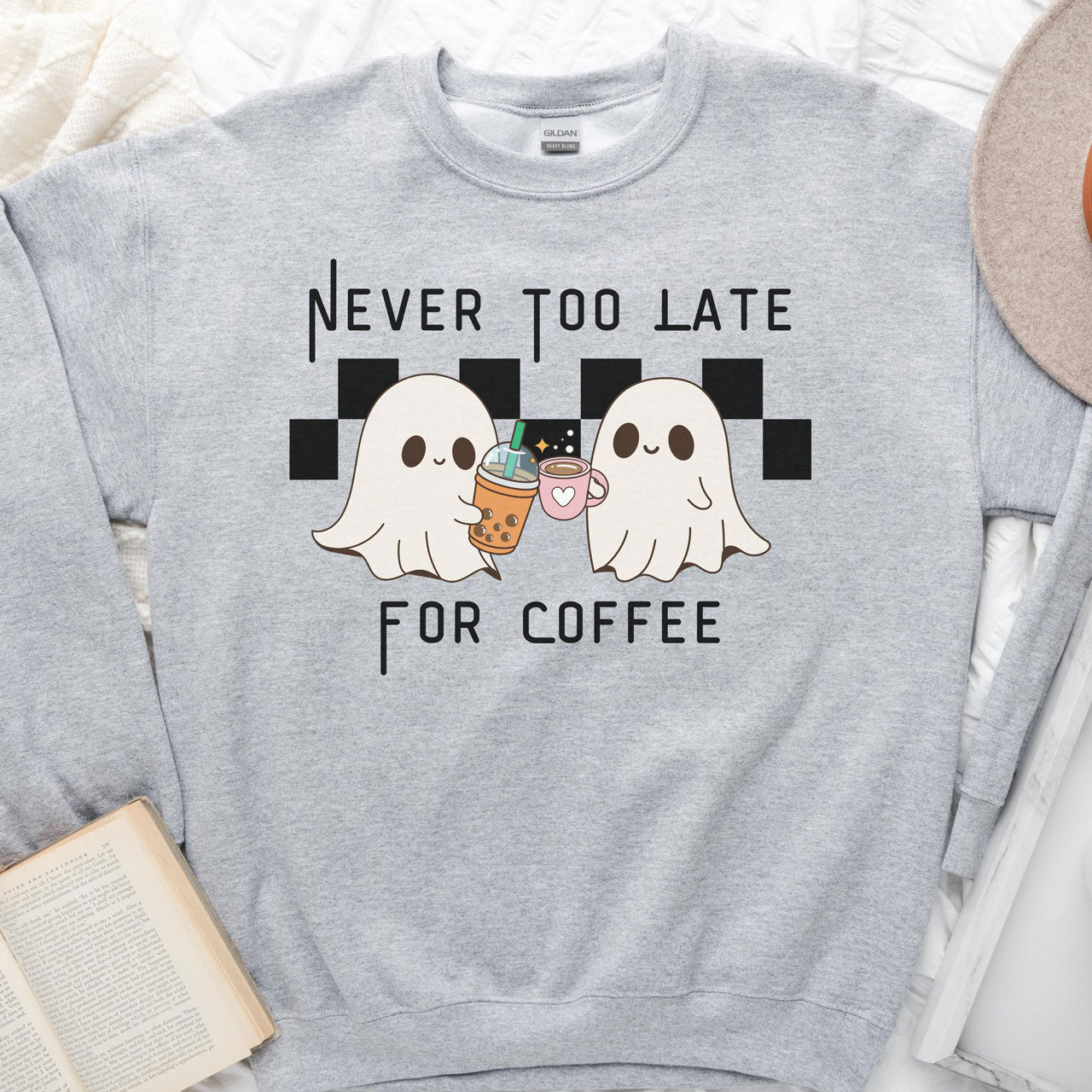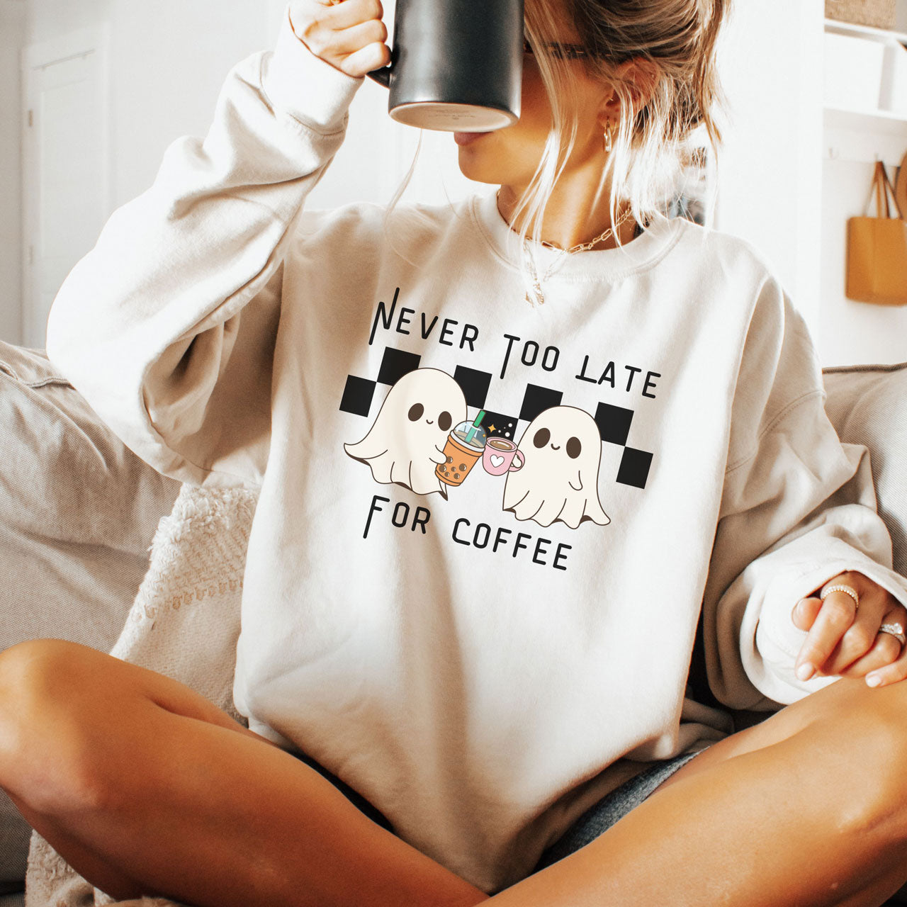 A couple of adorable retro style ghosts are front and center on this cozy Never Too Late for Coffee sweater. Perfect for Halloween and coffee enthusiasts alike, this shirt adds a playful retro vibe to your seasonal wardrobe while keeping you safely snug and warm.