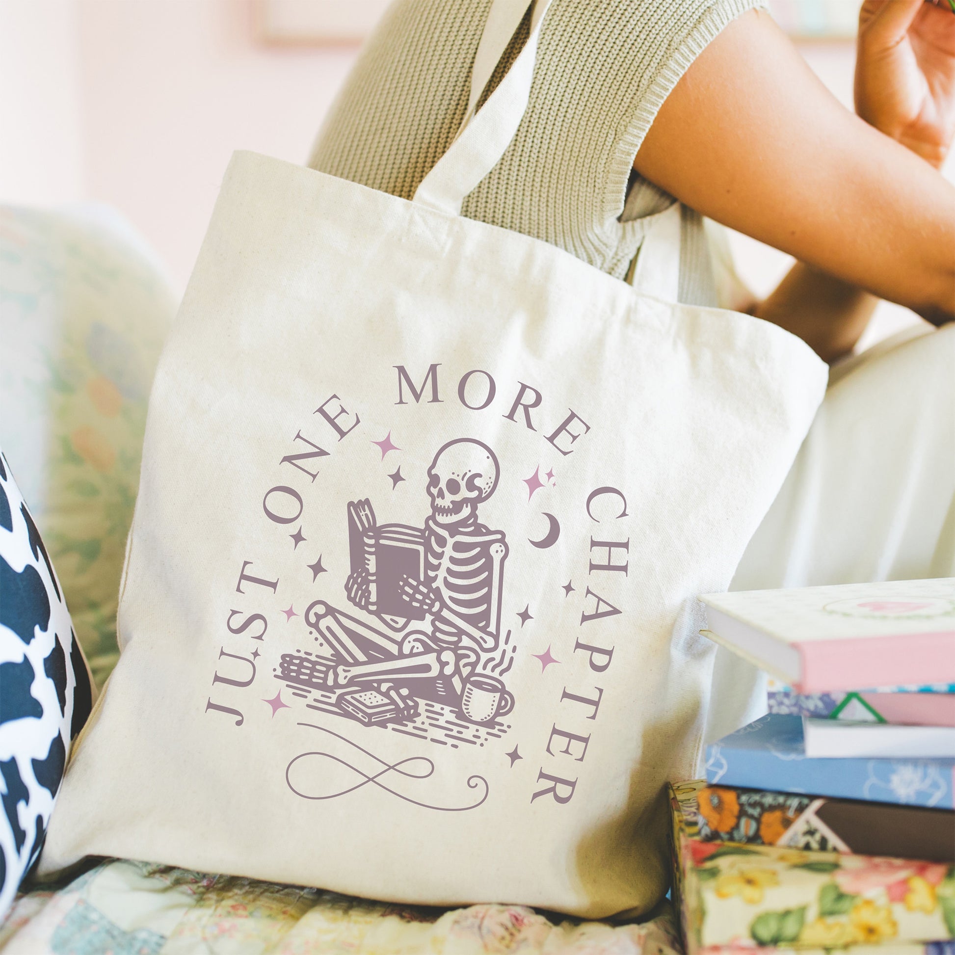 Embrace your love for books with this whimsical tote bag, featuring an adorable skeleton engrossed in a great read. It's perfect for avid readers who can never quite put their book down, even if it means staying up way past bedtime.
