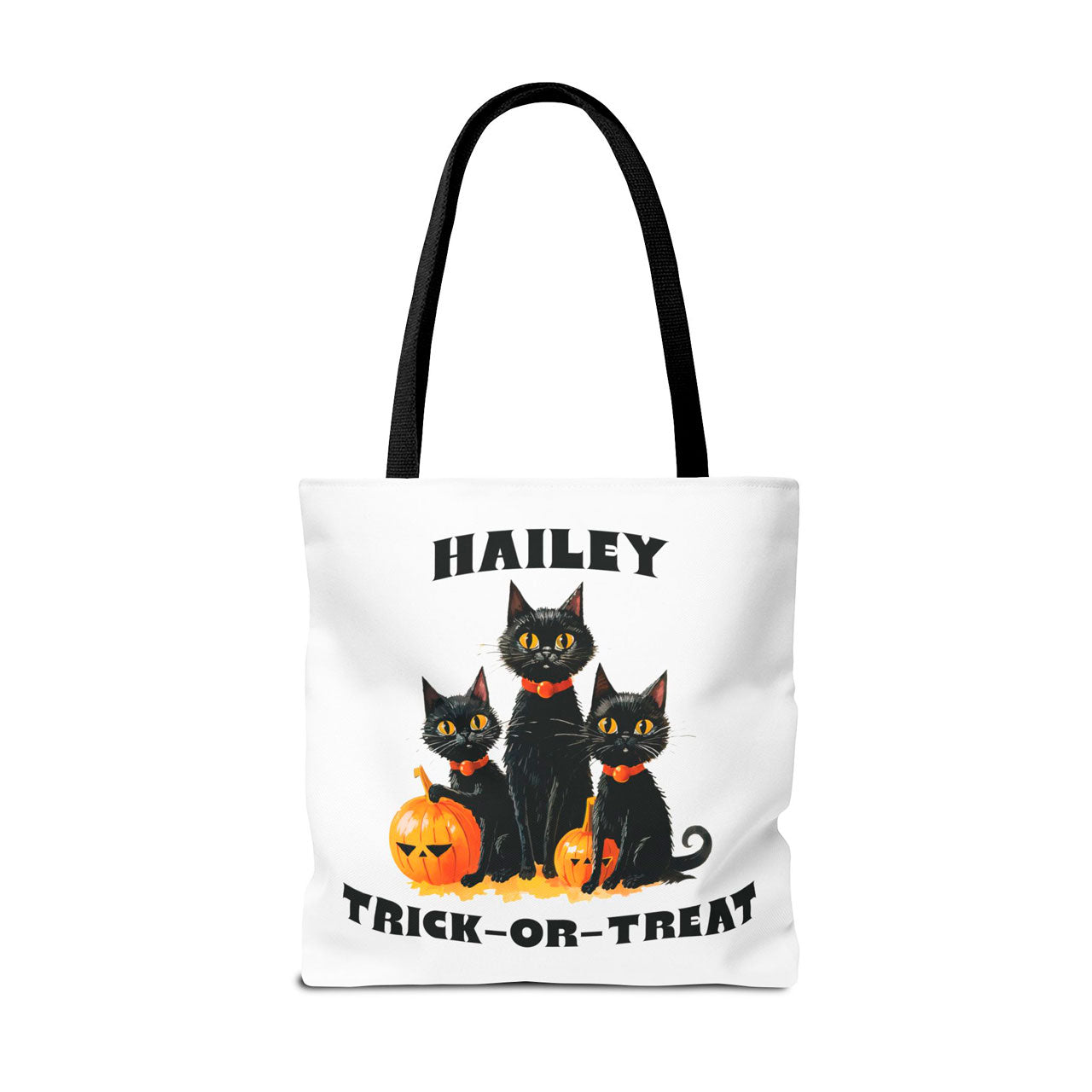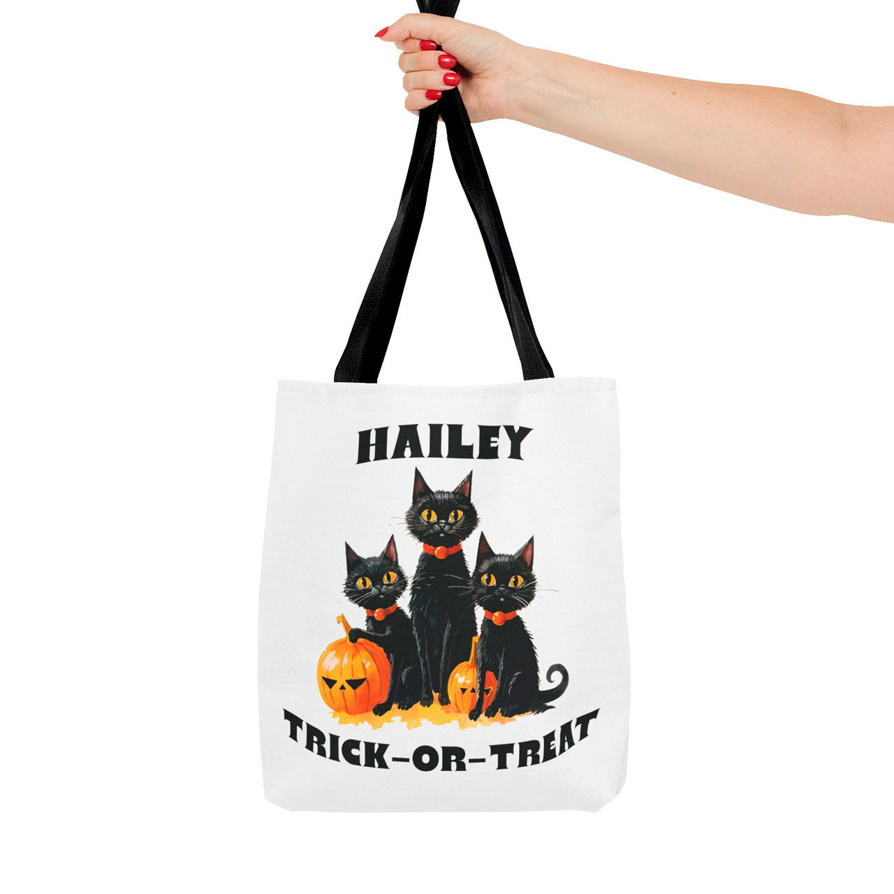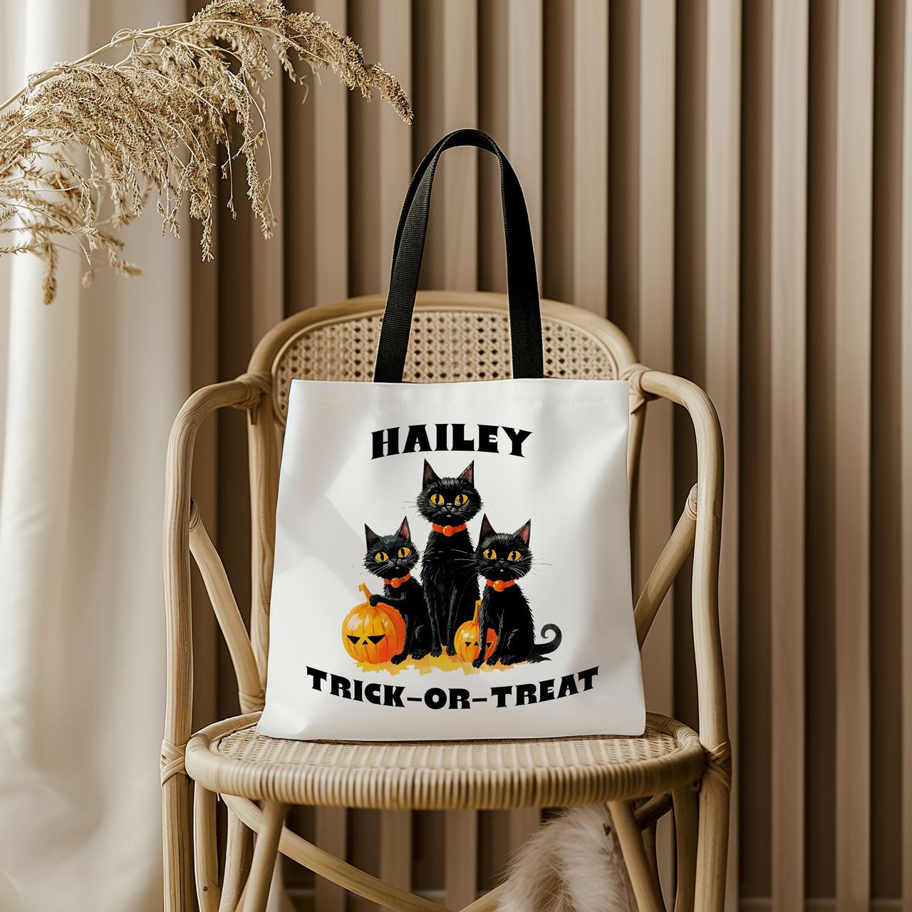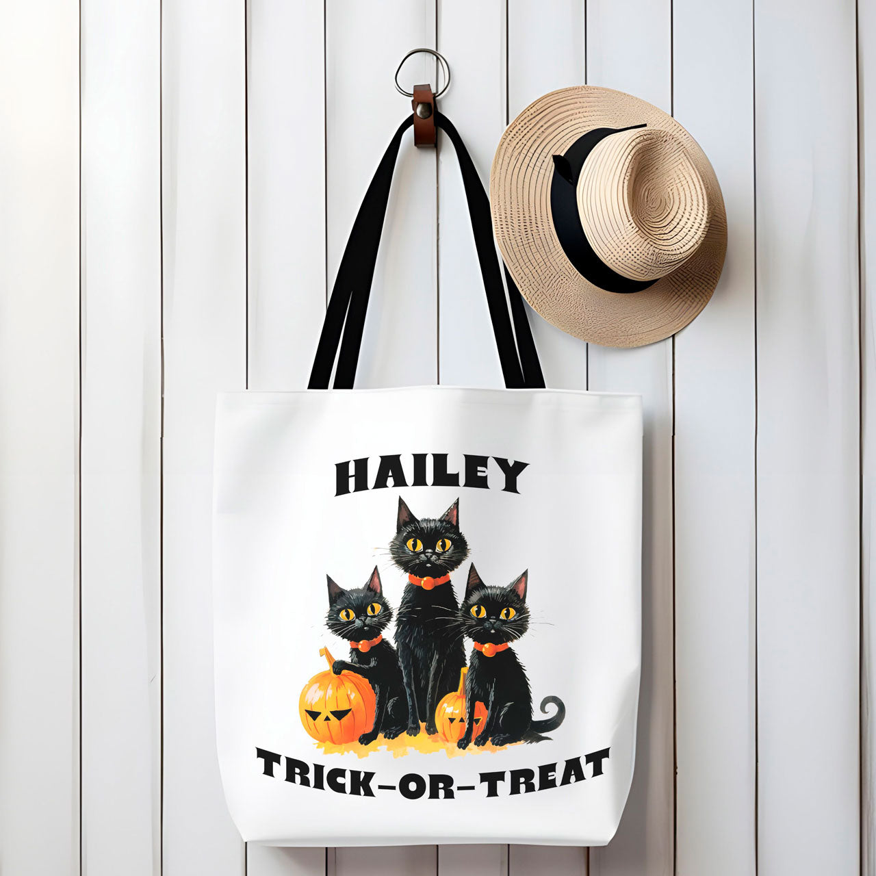 Made from a durable polyester blend, it's roomy enough to hold all your favorite treats and treasures. Personalize it with your name or your little one's name for an extra special touch that makes this bag truly one-of-a-kind. Whether you're collecting candy door-to-door or just want a cute accessory for the season, this tote bag is the purrfect choice for all your Halloween fun!