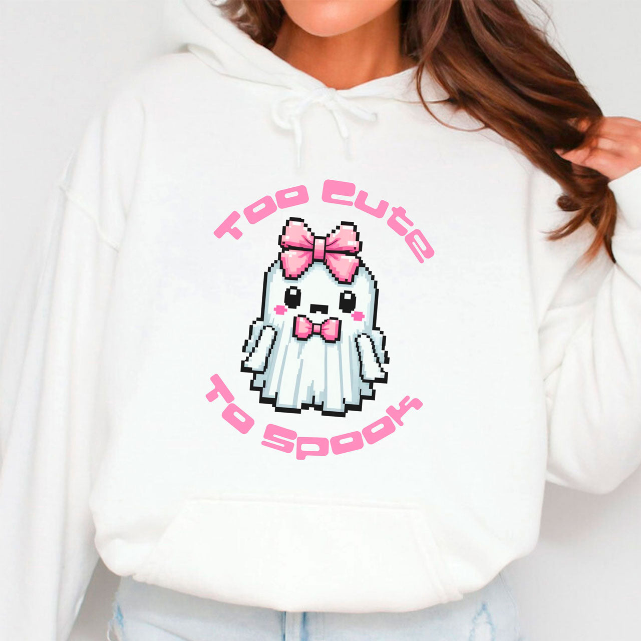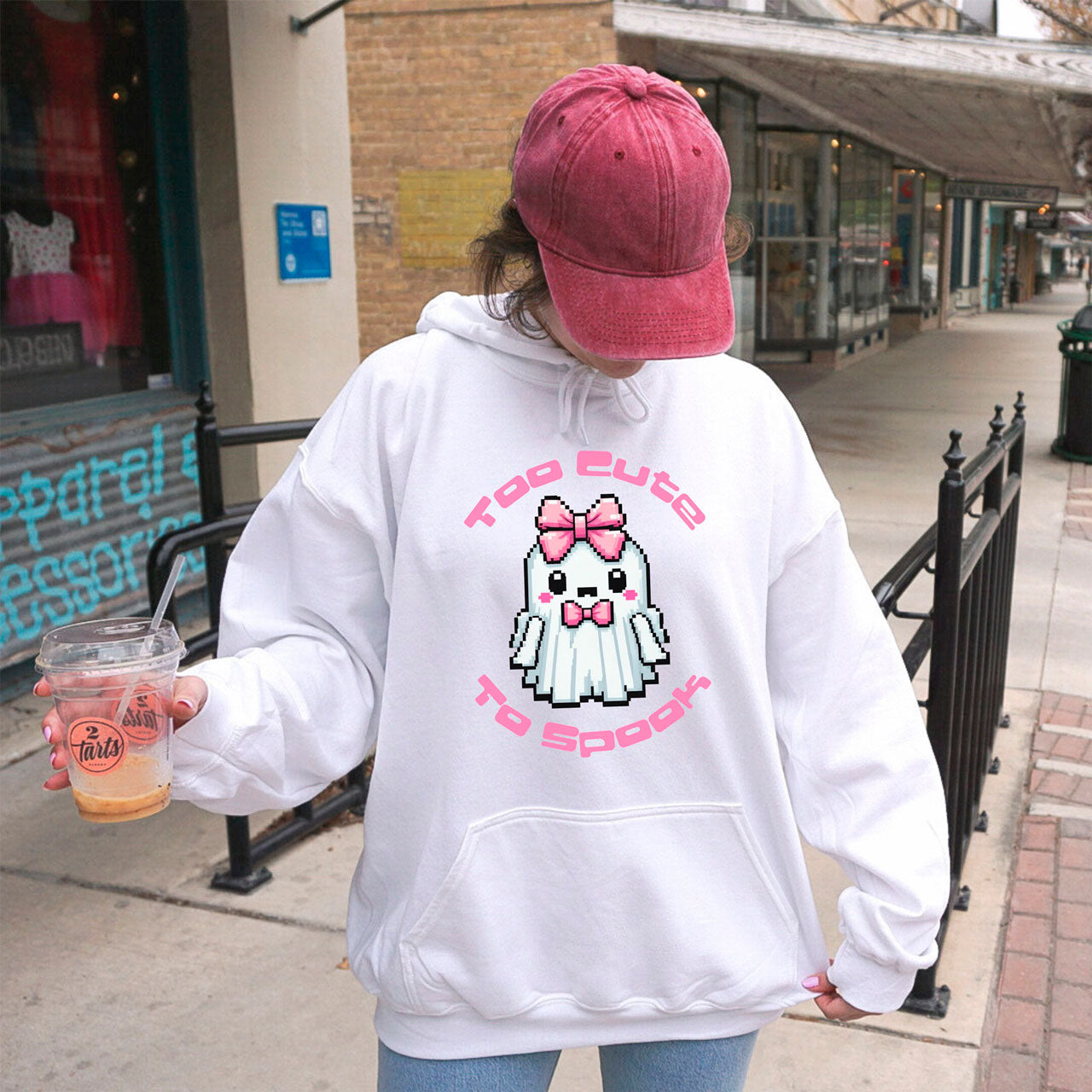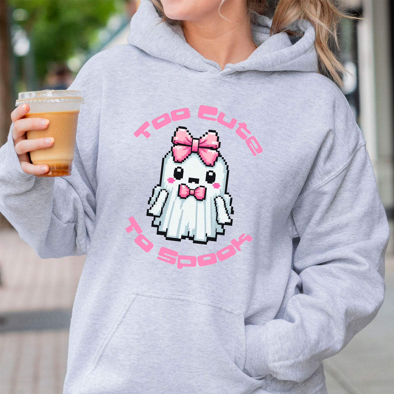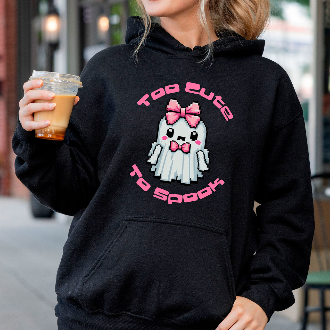 An adorable pixel-style Y2K ghost is front and center on this cozy “Too Cute to Spook" Halloween hoodie, Perfect for Halloween enthusiasts, gamers, and anyone with a love for retro aesthetics, this shirt adds a playful retro vibe to your seasonal wardrobe.