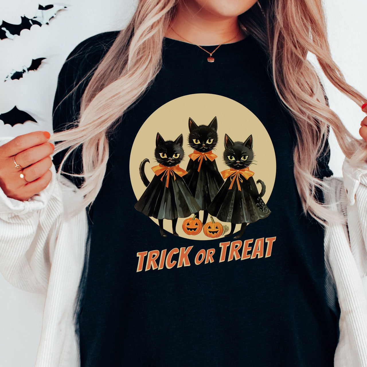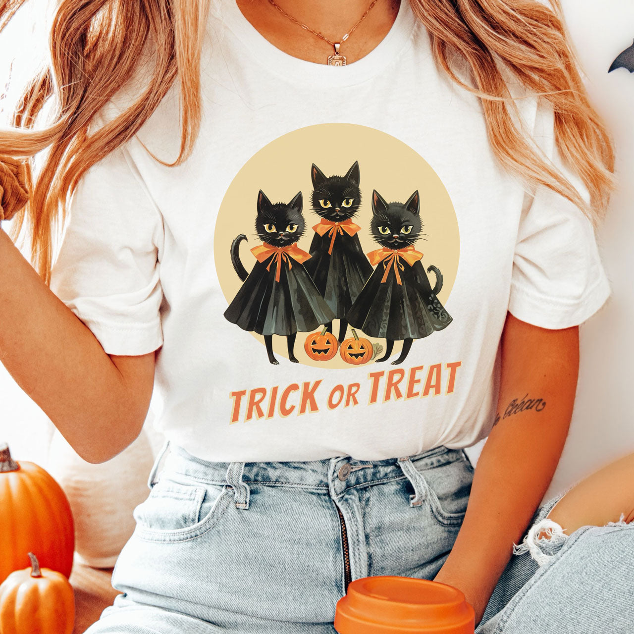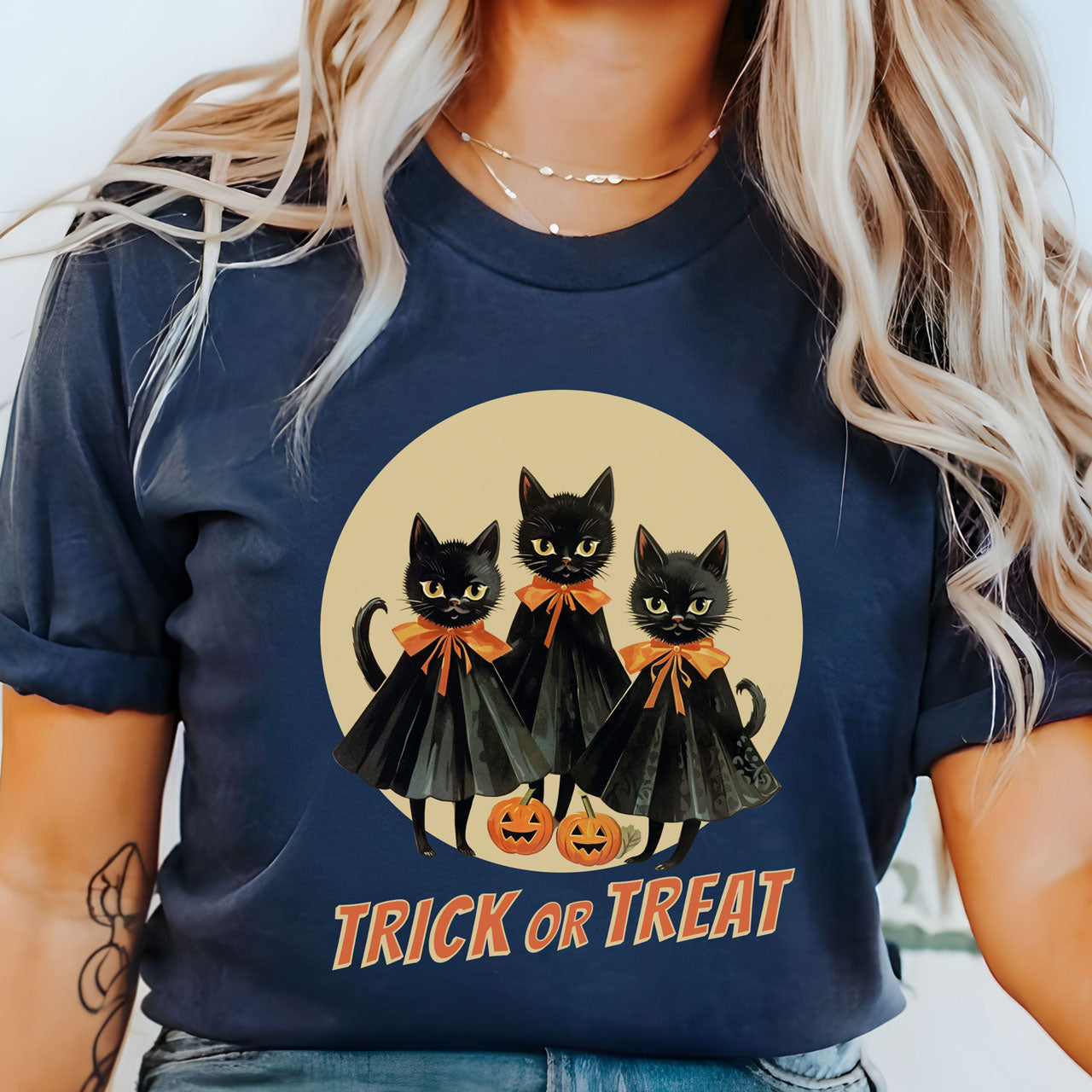 This classic Halloween tee features some charming vintage black cats to bring a nostalgic touch to your festive fall wardrobe.