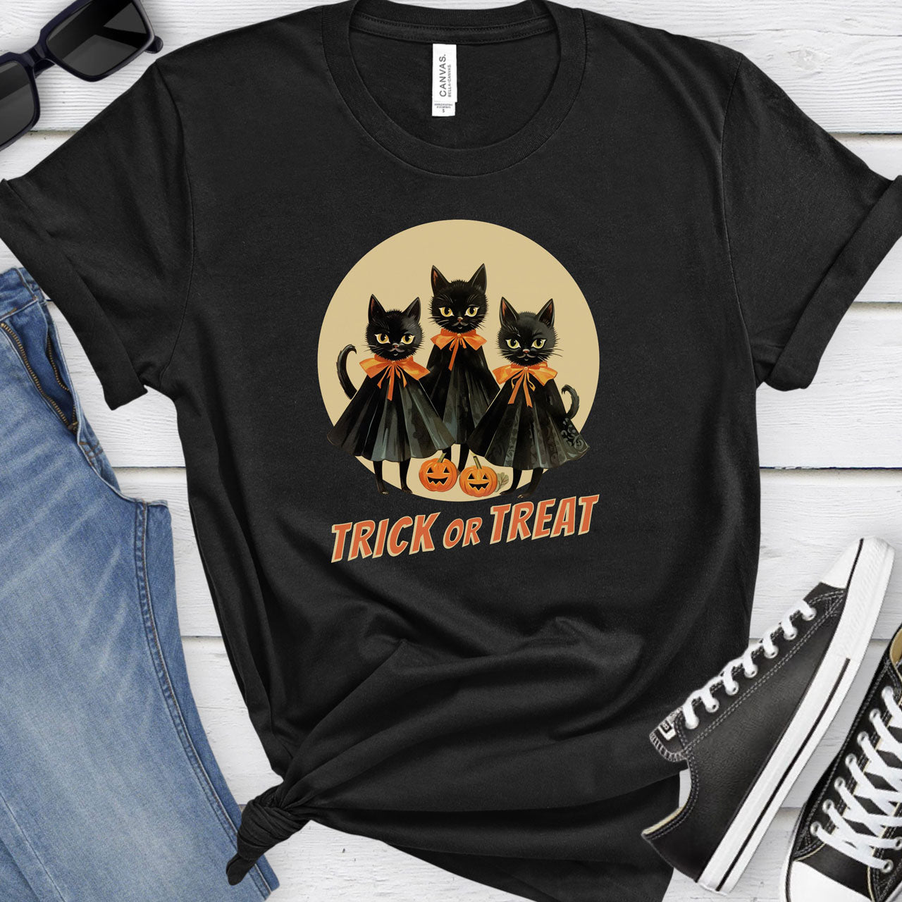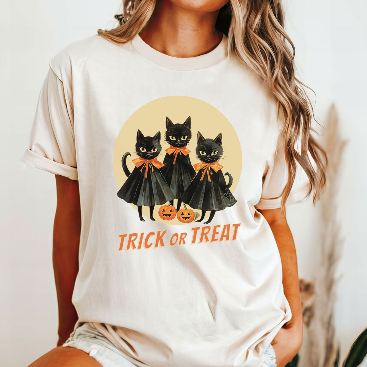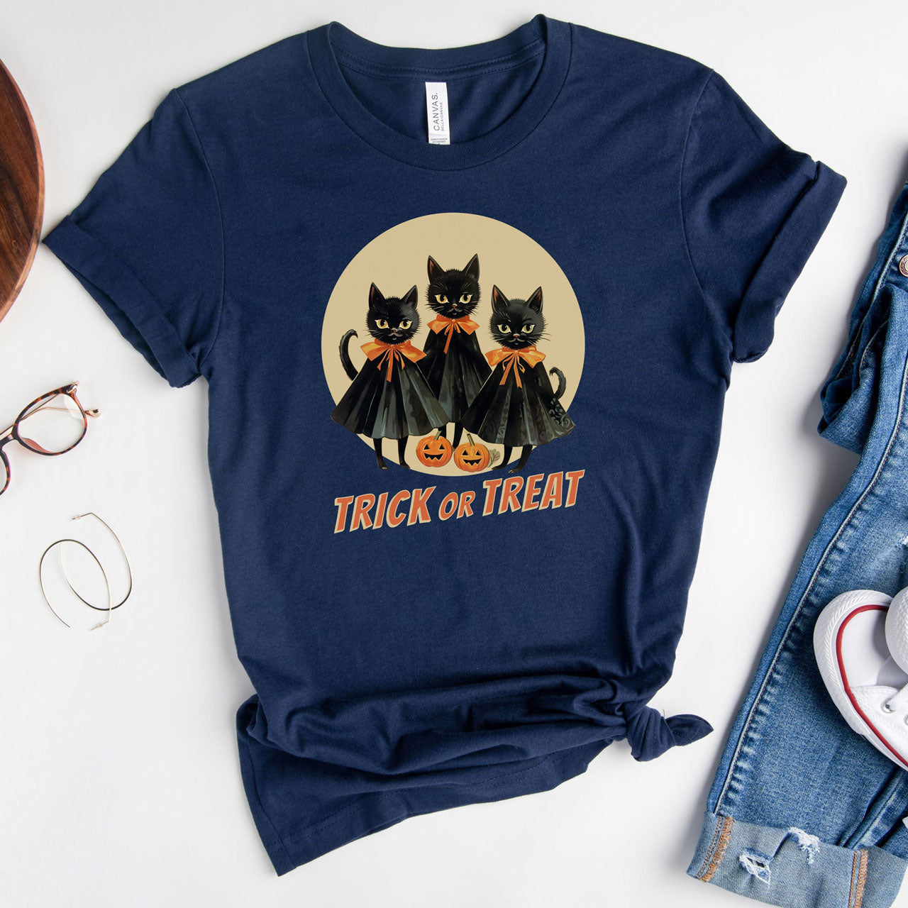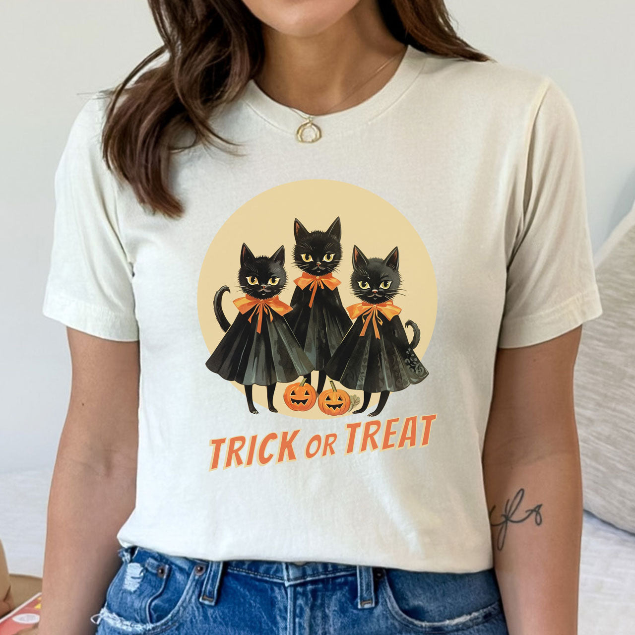 This classic Halloween tee features some charming vintage black cats to bring a nostalgic touch to your festive fall wardrobe.