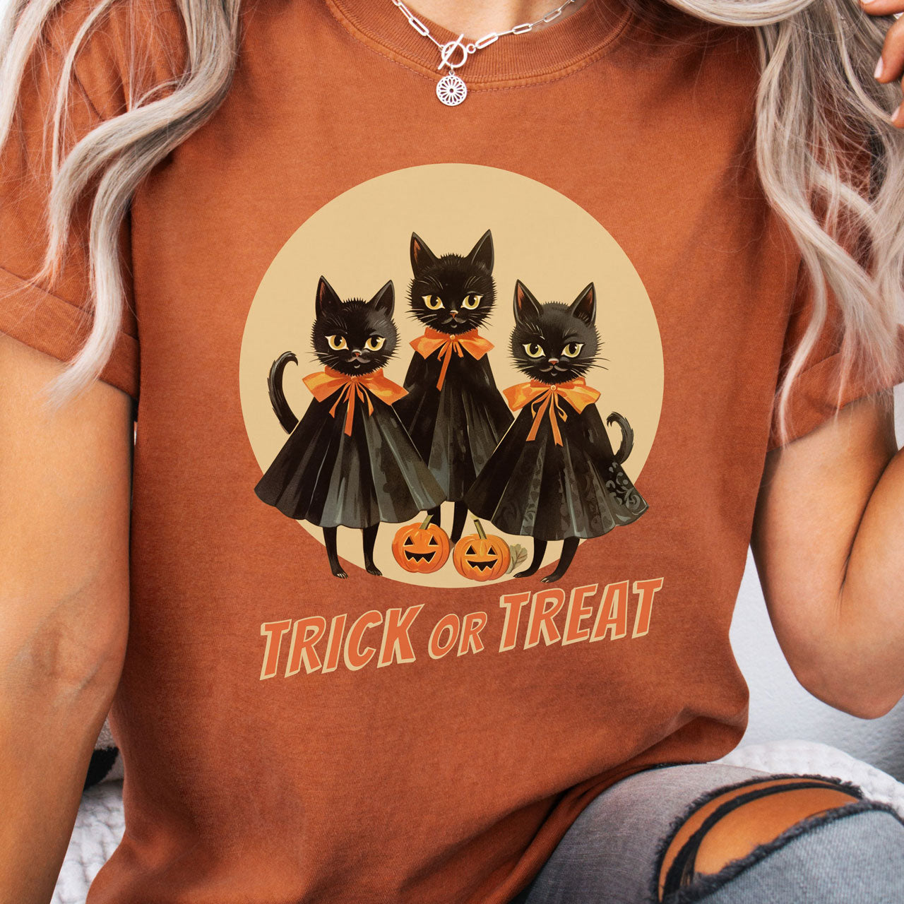 Available in a range of sizes and autumnal colors, our "Trick or Treat" tee also makes a fantastic gift for friends and family who love the vintage Halloween vibe.